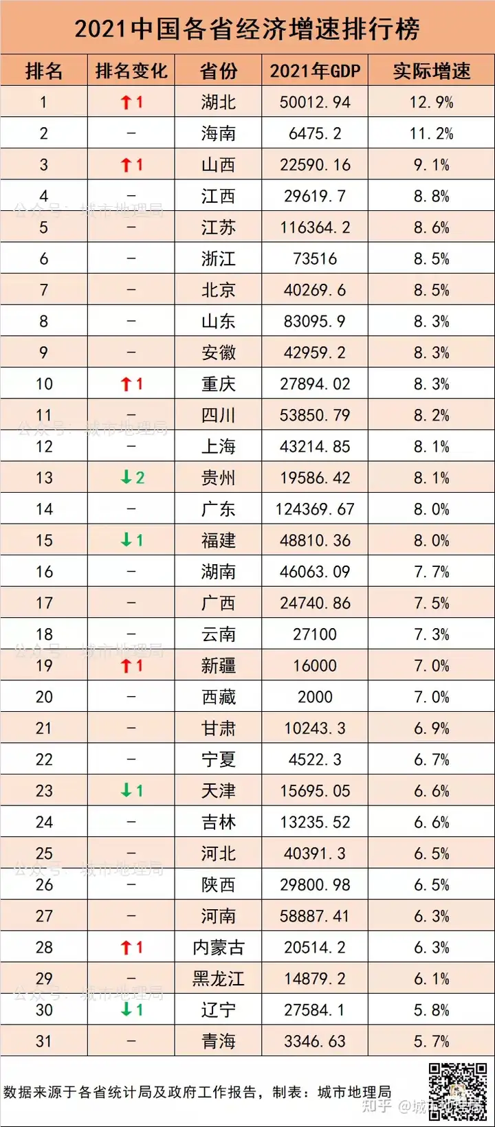 8 {5 G; f' D1 S" E/ n" [4 K 从增速上看,湖北、海南、山西分别以12.9%、11.2%、9.1%位居增速排行榜前三甲其中在2020年受疫情影响的湖北逐渐回归常态,2021年的经济增速拿了全国第一,并且在经济总量上超越福建,夺回经济总量第7的位置。 " w$ r6 y% ?- X4 k